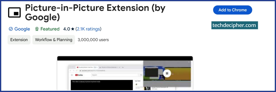 This official Google extension lets you watch videos in a floating Picture-in-Picture (PiP) window. You can continue browsing other tabs while keeping the video visible and adjustable. It works with most video platforms, including YouTube, Netflix, and more.