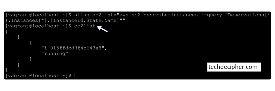 alias ec2list=”aws ec2 describe-instances –query “Reservations[*].Instances[*].[InstanceId,State.Name]””
