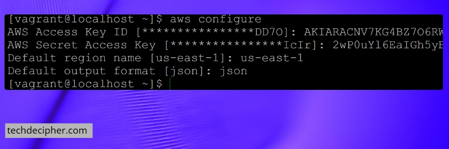 Installation is completed, now we need to configure it so we can interact with AWS resources further. Configuration isn’t a big of a deal, actually, you just follow the commands below, and that would do it.