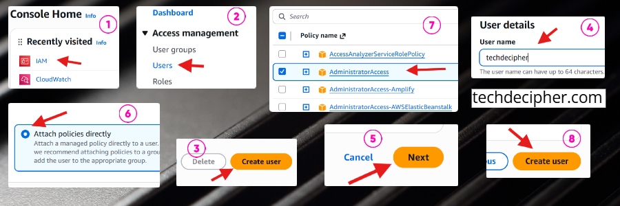 Log in to your AWS account and access the IAM service. Once you are in the IAM, look for the Users section and click it. Click on Create user to create a user and give it a user name, and click Next. Now, next is about attaching the policies to your user, which basically means what your created user gets to do with the level of access. Be very sure with this step because it is very important what level of access you are giving to the user, as you don’t want to risk your account or your company’s account just because someone was goofing around.