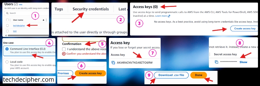 You get 2 options to retrieve the access keys, one is what you will be shown in the screen right after you create an access key, and the second is a CSV file. You can download a CSV file to keep a note for any unfortunate event, like if you lost the notation of the key, then this CSV file can save you. The main reason behind that is that, access key and secret key can only be seen or downloaded once, if you miss that, feel free to re-create it again.