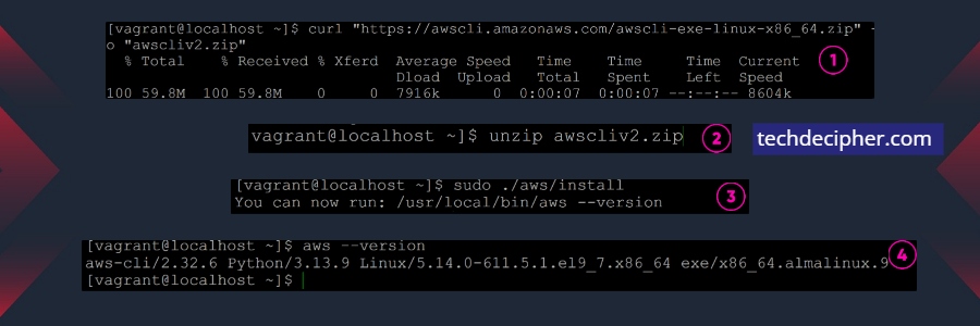 We have completed IAM user creation and access key IDs generation, its time to actually install the AWS CLI in your machine. Think of this as your connector, the connector which is AWS CLI is gonna use the keys to access resources or perform any operation on the cloud using commands. For this blog, I am installing it on one of the Linux flavours, Alma Linux 9. If you ever wish to do this on a Windows machine instead, grab the MSI installer from the link here. Now I am continuing with Linux, assuming you have logged on to the machine, please follow commands below to install AWS CLI.