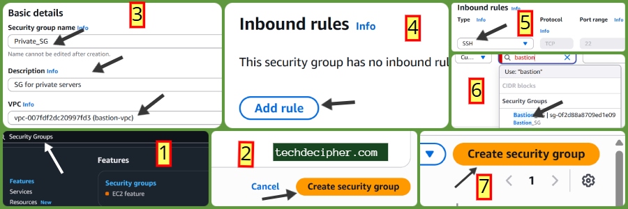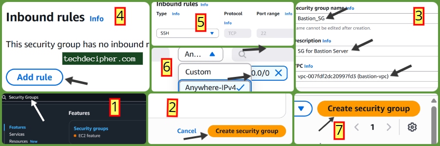 Security Groups act as firewalls for your instances. We’ll create two, one for the Bastion host and one for the private servers.