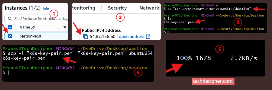 scp -i “k8s-key-pair.pem” “k8s-key-pair.pem” ubuntu@54.82.158.60:/home/ubuntu/.ssh/k8s-key-pair.pem