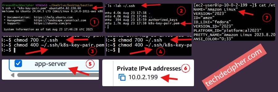 This command copies .pem key file to the Bastion host under /home/ec2-user/.ssh/. Once successful, you’re ready for Step 8 – SSH into Private Servers through Bastion. Without this step, the Bastion won’t have the credentials required to connect to private instances.