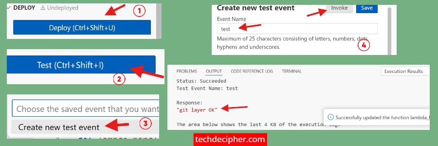 Add above piece of code in lambda function, click deploy and hit test. That’s it, if you get git layer OK means you have properly configured a git layer in your lambda function.