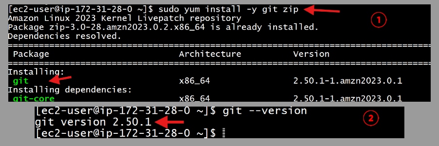 Now here is the important part. We are installing Git because our goal is to create a Lambda layer that contains Git. Later, we will use this git layer to run git commands in a Lambda function that needs it. Since the Lambda runtime does not include Git by default, we must manually package Git into a Lambda layer. So we install Git inside EC2 first. We are also installing a zip package because we would need it to zip the layer.