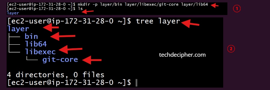 We are creating the exact folder structure that will contain the components for the Lambda Layer. We create these folders first because we need proper locations to place Git binaries, Git helper tools, and required libraries.