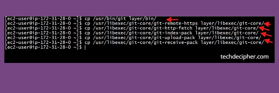 In this step we are going to build the layer. We will include only what Git needs such as git binary, required git helpers and required shared libraries.