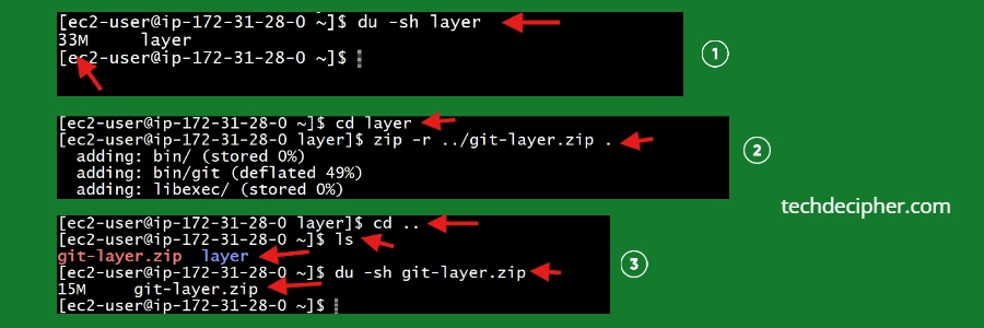 Its time we also zip the layer, goto the actual directory of the layer and run the above command. This command will zip your layer which we can use to upload to Layers section of Lambda Function.