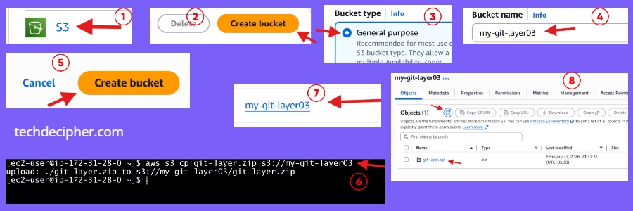 Once the bucket is created, note down its bucket name and come back to the instance box terminal. And run the above command, which copies the zipped layer ready for the layer deployment. Please replace the bucket name with your bucket name. Once the commands is run, you would see the uploaded file in the bucket.