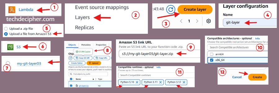 You also need to ensure compatible runtimes, which is a version that is compatible with, in my case the git layer I am setting up is compatible with Python version 10 to 12 so selected those as seen in screenshot.